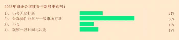 超過70%的投資者表示將繼續(xù)打新,這一數(shù)字較去年同期下降了近10個百分點。其中,21%的投資者堅持打新,較去年同期下降了6個百分點;50%的投資者表示視具體個股情況選擇性打新,較去年同期下降了2個百分點;17%的投資者表示,將觀察一段時間再決定,較去年同期上升了4個百分點;12%的投資者表示未來不會參與打新,較去年同期上升了3個百分點。