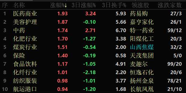 行業(yè)方面,截至2月17日11:30,86類行業(yè)中43類上漲,占比50%,其中,醫(yī)藥商業(yè)行業(yè)漲幅居首,達(dá)1.93%,此外,美容護(hù)理、中藥、化肥行業(yè)、煤炭行業(yè)、保險(xiǎn)、食品飲料、化纖行業(yè)等行業(yè)漲幅也超1%。下跌方面,互聯(lián)網(wǎng)服務(wù)行業(yè)跌幅居首,達(dá)2.69%,此外,半導(dǎo)體、軟件開發(fā)、通信服務(wù)行業(yè)等行業(yè)跌幅也均超1%。