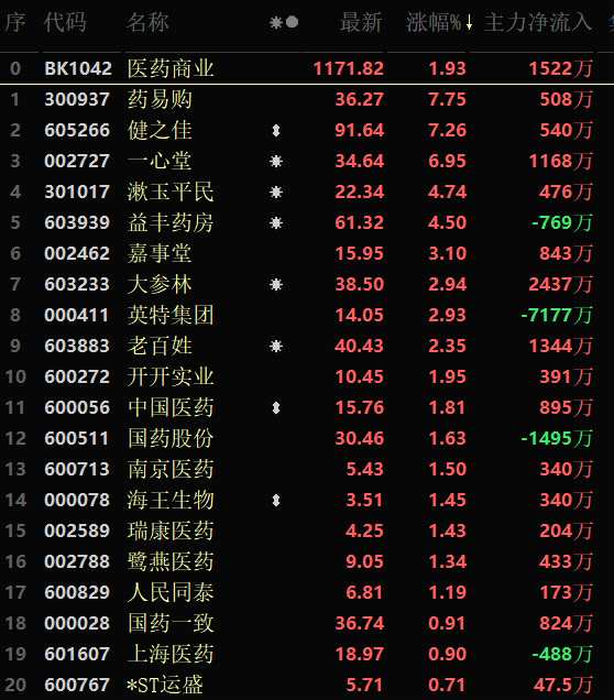 從早盤表現(xiàn)相對(duì)強(qiáng)勢(shì)的醫(yī)藥商業(yè)行業(yè)看,交易中的30只成份股中有27只上漲,其中,有3只個(gè)股漲幅超5%。資金方面,有1522萬(wàn)元大單資金凈流入該行業(yè),居各行業(yè)第14位。