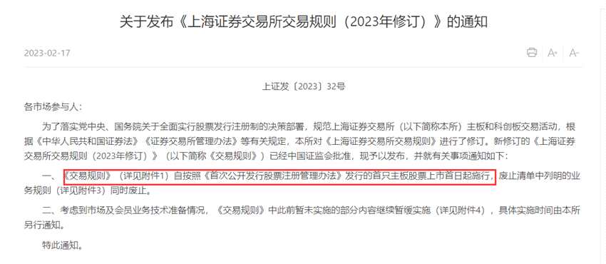 不過,值得注意的一點(diǎn)是,很多機(jī)構(gòu)和投資者對(duì)于該文件有所誤讀,即認(rèn)為這些制度在發(fā)布后的首個(gè)交易日,即2月20日就將開始實(shí)施,而事實(shí)上,交易所的公告是,自注冊(cè)制首只主板股票上市受日期施行。