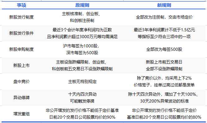 2月17日,中國(guó)證監(jiān)會(huì)發(fā)布全面實(shí)行股票發(fā)行注冊(cè)制相關(guān)制度規(guī)則,涉及新股發(fā)行、交易規(guī)則、異動(dòng)停牌等多項(xiàng)與投資者關(guān)系密切的新內(nèi)容,在證監(jiān)會(huì)發(fā)布相關(guān)內(nèi)容后,證券交易所、全國(guó)股轉(zhuǎn)公司、中國(guó)結(jié)算、中證金融、證券業(yè)協(xié)會(huì)配套制度規(guī)則同步發(fā)布實(shí)施。其中部分與投資者關(guān)系較大的變化,已在下表中整理。