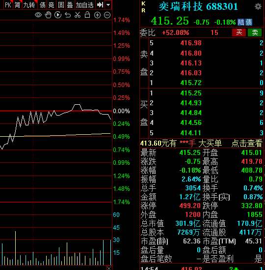 值得注意的是,2%的價(jià)格籠子,指的并非是現(xiàn)價(jià),而是最優(yōu)對(duì)手盤的價(jià)格,我們以奕瑞科技為例,該股是科創(chuàng)板個(gè)股,有2%價(jià)格籠子,該股現(xiàn)價(jià)為415.25元,但買入掛單時(shí)的基準(zhǔn)價(jià)指的是最低賣價(jià)(415.72元),再乘以1.02或0.98,才是買入價(jià)格的范圍。而賣出價(jià)格由于最高的買盤價(jià)格為415.25元,則以此為基準(zhǔn)價(jià),再計(jì)算價(jià)格籠子的范圍。