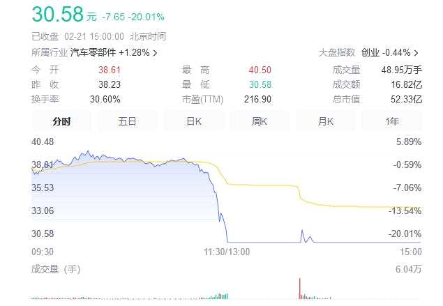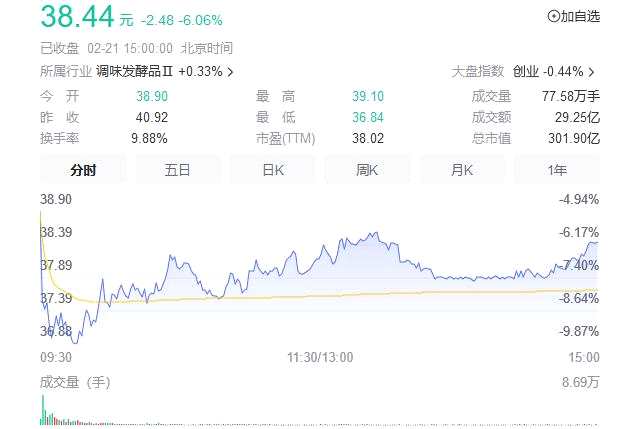 醬油龍頭中炬高新今日盤中大幅跳水,一度逼近跌停,截至收盤,該股跌約6%報(bào)38.44元,最新市值302億元。