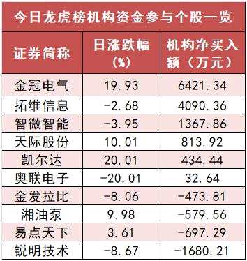 盤后龍虎榜數(shù)據(jù)顯示,機構現(xiàn)身10股,其中金冠電氣等6股現(xiàn)機構資金凈買入,【銳明技術(002970)、股吧】(002970)等4股呈現(xiàn)機構資金凈賣出。