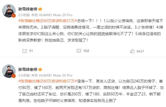 事情經(jīng)過是這樣的:有媒體報道,2月20日,粉絲數(shù)646.4萬的知名升學(xué)規(guī)劃博主張雪峰在社交平臺個人主頁發(fā)帖稱:“還了6年房貸,每年10萬,一共還了3萬本金,57萬利息……這合理么???真的我現(xiàn)在是個文明人,要不然我……”網(wǎng)帖發(fā)出后,引發(fā)普遍關(guān)注和網(wǎng)友熱議。