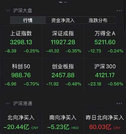 隔夜美股暴跌,對今天A股早盤階段影響不小,三大指數(shù)均低開震蕩。之后在醫(yī)藥、白酒等板塊帶動下,指數(shù)跌幅收窄。截至收盤,上證指數(shù)下跌0.25%,報3298.13點,深證成指下跌0.35%,創(chuàng)業(yè)板指下跌0.48%,北向資金凈流出20.44億元。
