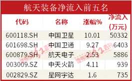 航天裝備板塊今日放量啟動,7只成分股平均漲幅達4.31%。不過,由于成分股市值偏小,只有中國衛(wèi)星(600118)1只個股資金流入超過億元,中國衛(wèi)星上午漲停,機構(gòu)資金流入額5.03億元。另外中國衛(wèi)通(601698)放量大漲9.27%,流入額6403萬元。