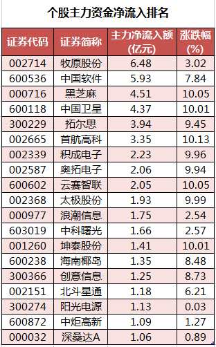 個股來看,今日有1742只個股獲主力資金凈流入,其中,20股獲主力資金凈流入超1億元。牧原股份(002714)獲主力資金凈流入最多,凈流入金額為6.48億元;主力資金凈流入居前的個股還有中國軟件、黑芝麻(000716)、中國衛(wèi)星(600118)、拓爾思(300229)、首航高科(002665),凈流入金額分別為5.93億元、4.51億元、4.37億元、3.94億元、3.35億元。