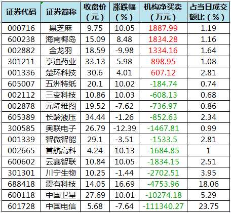 盤后龍虎榜數(shù)據(jù)顯示,今日機構席位資金合計凈賣出約13.14億元。其中,凈買入的個股5只,凈賣出的個股12只。機構凈買入最多的股票是黑芝麻,凈買入金額約1887.99萬元;機構凈買入居前的還有海南椰島(600238)、金龍羽(002882)等股。機構凈賣出最多的股票是中國電信,凈賣出金額約11.13億元;機構凈賣出居前的還有中國衛(wèi)星、震有科技、川寧生物(301301)等股。