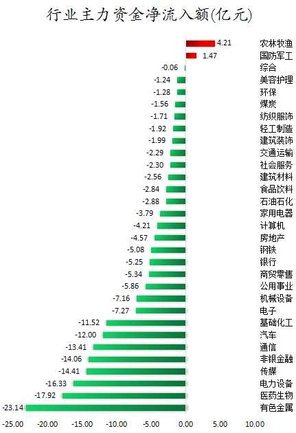從行業(yè)板塊來看,申萬所屬的31個一級行業(yè),今日僅有農(nóng)林牧漁、國防軍工2個行業(yè)板塊主力資金呈現(xiàn)凈流入,凈流入金額分別為4.21億元、1.47億元。29個行業(yè)板塊主力資金呈現(xiàn)凈流出,其中,有色金屬行業(yè)板塊主力資金凈流出最多,凈流出金額為23.14億元;行業(yè)板塊主力資金凈流出靠前的還有醫(yī)藥生物、電力設備、傳媒、非銀金融、通信,凈流出金額分別為17.92億元、16.33億元、14.41億元、14.06億元、13.41億元。