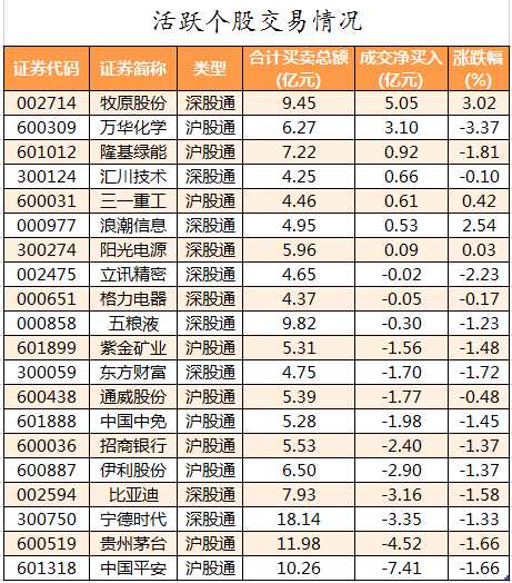 活躍個股方面,北向資金今日凈買入較多的有牧原股份、萬華化學(600309)、隆基綠能(601012)、匯川技術(300124)、三一重工(600031),凈買入金額分別為5.05億元、3.1億元、0.92億元、0.66億元、0.61億元。北向資金凈賣出較多的有中國平安、貴州茅臺(600519)、寧德時代(300750)、比亞迪、伊利股份(600887),凈賣出金額分別為7.41億元、4.52億元、3.35億元、3.16億元、2.9億元。