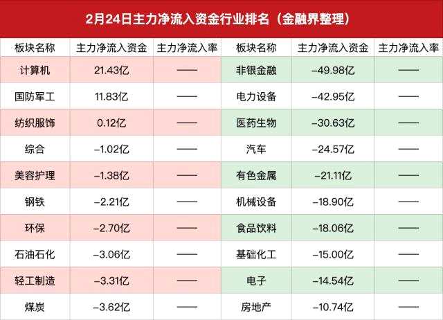 資金流向上,僅3個(gè)行業(yè)獲主力資金凈流入,其中計(jì)算機(jī)行業(yè)獲主力凈流入21.43億元居首;其次是國防軍工行業(yè)凈流入11.83億。主力資金凈流出的28個(gè)行業(yè)中,非銀金融凈流出49.98億元,其次是電力設(shè)備、醫(yī)藥生物、汽車、有色金屬等周四主力流入居前的行業(yè)。