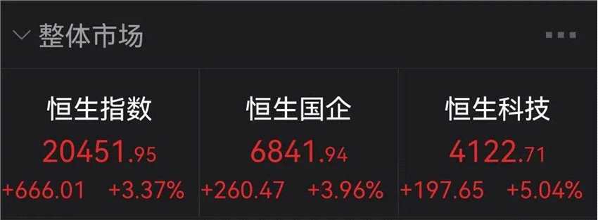 港股市場上午也是全線大漲。截至上午收盤,恒生指數(shù)大漲逾3%,恒生科技指數(shù)漲逾5%。個股方面,騰訊控股、阿里巴巴漲幅均在5%以上,百度、網(wǎng)易漲超6%,騰訊、阿里巴巴漲超5%,小米、京東、美團(tuán)皆上漲。