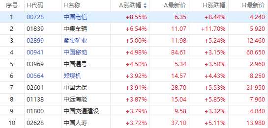 截至發(fā)稿,中國(guó)電信(601728)A股漲超8%,H股現(xiàn)漲超8%,中集車輛(301039)A股漲超6%,H股現(xiàn)漲超11%,紫金礦業(yè)(601899)A股漲5%,H股現(xiàn)漲超5%。