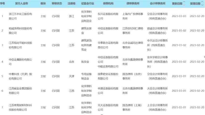 在滬深交易所已受理的432單主板在審項(xiàng)目中,記者注意到,目前僅有8單申請(qǐng)進(jìn)入問(wèn)詢環(huán)節(jié),其中7家為IPO項(xiàng)目,均來(lái)自上交所。