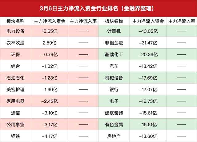 資金流向上,2個行業(yè)獲主力資金凈流入,其中電力設備行業(yè)獲主力凈流入17.72億元居首;農林牧漁行業(yè)主力凈流入2.59億元。主力資金凈流出的29個行業(yè)中,計算機行業(yè)凈流出43.05億元,非銀金融凈流出31.47億元,基礎化工凈流出20.36億元。