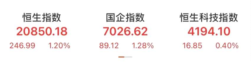 今天上午,港股低開后震蕩盤整,10時(shí)左右,三大股指突然集體直線拉升,其中恒生指數(shù)瞬間大漲400點(diǎn)。截至上午收盤,恒生指數(shù)上漲1.2%、恒生國企指數(shù)上漲1.28%、恒生科技指數(shù)上漲0.4%。