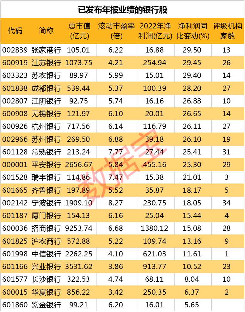 在其余銀行股中,張家港行(002839)、蘇農(nóng)銀行(603323)、成都銀行(601838)、江陰銀行(002807)等8股凈利潤增長迅速,同比增幅均落在25%-30%區(qū)間。