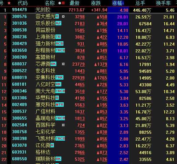 具體看,截至3月9日上午收盤,光刻膠板塊漲幅居首達(dá)4.98%。其中,容大感光(300576)、雙樂(lè)股份(301036)等概念股20cm漲停。