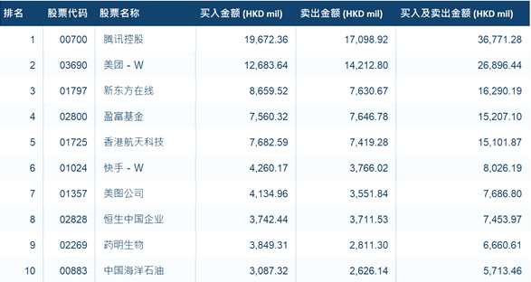 成交活躍股票方面,港股通(滬)南下資金前三大成交股為騰訊控股(700)、美團(tuán)-W(3690)和盈富基金(2800);而港股通(深)南下資金前三大成交股為騰訊控股(700)、美團(tuán)-W(3690)和新東方在線(1797)。