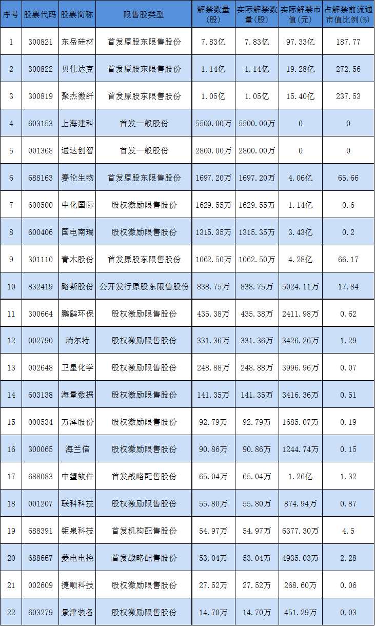 從解禁數(shù)量來看,東岳硅材(300821)、貝仕達(dá)克(300822)、聚杰微纖(300819)解禁股數(shù)超一億股,解禁股數(shù)分別為7.83億股、1.14億股、1.05億股。從解禁市值來看,東岳硅材、貝仕達(dá)克、聚杰微纖解禁市值超十億元,解禁市值分別為97.33億元、19.28億元、15.40億元。從解禁市值占解禁前流通市值比例來看,東岳硅材、貝仕達(dá)克、聚杰微纖解禁比例超100%,解禁比例為187.77%、272.56%、237.53%。