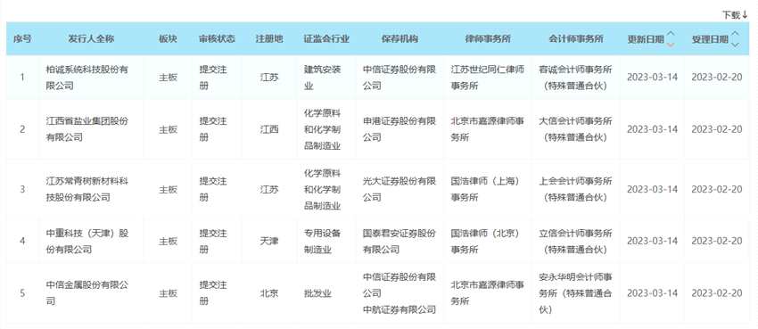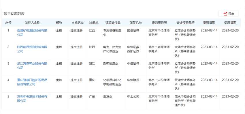 滬深交易所數(shù)據(jù)顯示,截至3月14日發(fā)稿,中信金屬、江鹽股份、常青科技、中重科技、柏誠股份、中電港、陜能股份、海森藥業(yè)、南礦集團、登康口腔等10家主板IPO企業(yè)提交注冊,這也是全面注冊制下首批提交注冊的主板IPO企業(yè)。