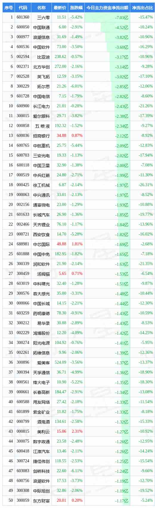 3月15日兩市主力減持前50只個股