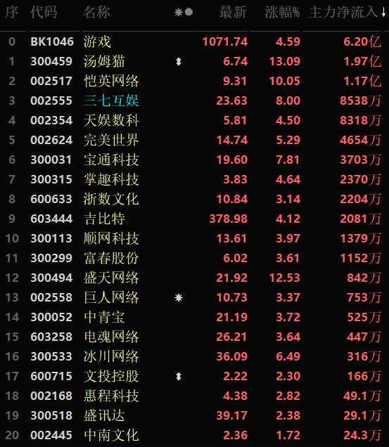 從早盤表現(xiàn)強(qiáng)勢的游戲行業(yè)看,該行業(yè)交易中的30只成分股中有29只上漲,其中,有8只個(gè)股漲幅超5%。資金方面,有6.20億元大單資金凈流入該行業(yè),居各行業(yè)資金凈流入排名第8位。