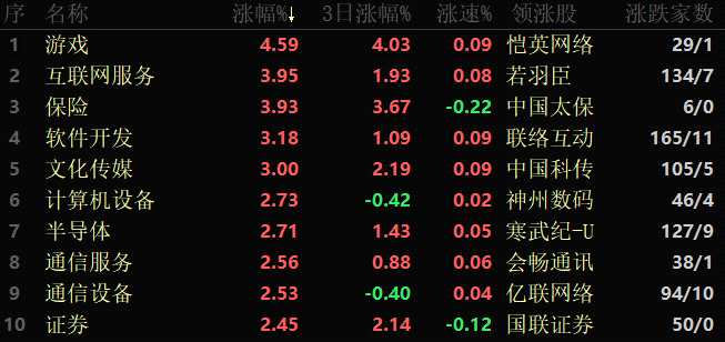 行業(yè)方面,截至3月17日11:30,86個(gè)行業(yè)板塊中76類上漲,占比88.37%,其中,游戲行業(yè)漲幅居首,達(dá)4.59%,另有包括互聯(lián)網(wǎng)服務(wù)、保險(xiǎn)、軟件開發(fā)和文化傳媒等行業(yè)漲幅均超3%。下跌方面,中藥跌幅居首,達(dá)0.85%。