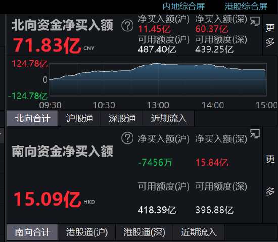 截至滬深股市收盤,北向資金早盤單邊掃貨近125億,午后流入額明顯收窄,全天凈買入71.83億元,本周5個交易日連續(xù)加倉累計近150億元。其中,滬股通凈流入11.45億,深股通凈流入60.37億元。