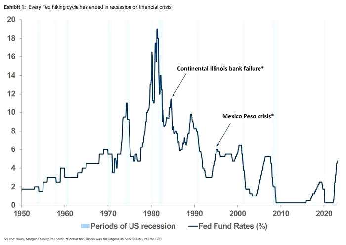 經(jīng)過過去兩周的事件,這種想法可以被擱置了?!斑^去70年的每一次加息周期都以衰退(約80%的時(shí)間)和/或金融危機(jī)(1984年和1994年)告終,”摩根士丹利駐倫敦首席歐洲股票策略師格雷厄姆.塞克(Graham Secker)說。