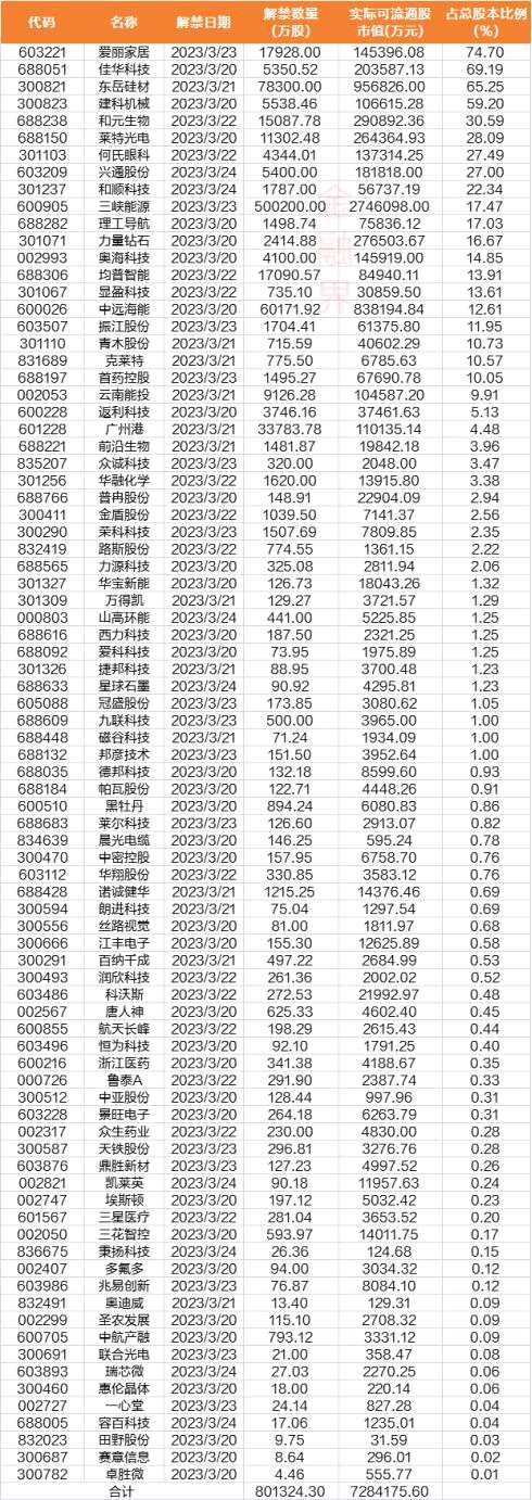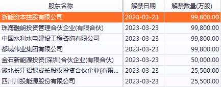 本周解禁數(shù)量最多的是三峽能源(600905)。該公司將有50.02億股首發(fā)原股東限售股份在3月23日到期,占解禁前流通股58.36%,市值高達274.6億元,占本周A股解禁市值總量的37.7%。解禁股東明細如下: