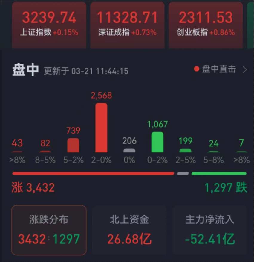 周二(3月21日),A股三大股指震蕩上漲,全線飄紅。截至上午收盤,上證指數(shù)漲幅達0.15%,報3239.74點;深證成指和創(chuàng)業(yè)板指漲幅分別為0.73%和0.86%;滬深兩市合計成交額5107.5億元,總體來看,兩市個股漲多跌少。