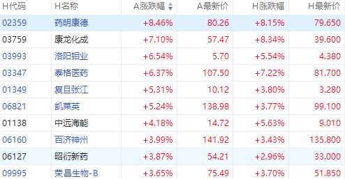 截至發(fā)稿,藥明康德(603259)A股漲8.46%,H股現漲8.15%,康龍化成(300759)A股漲7.1%,H股現漲8.34%,洛陽鉬業(yè)(603993)A股漲6.54%,H股現漲5.54%。