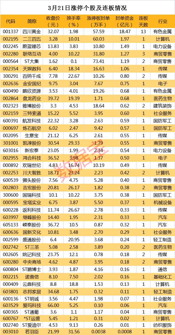 3月21日,6股封單金額超億元,其中四川黃金(001337)、二三四五(002195)、蔚藍鋰芯(002245)分別為18.47億元、1.97億元、1.49億元。