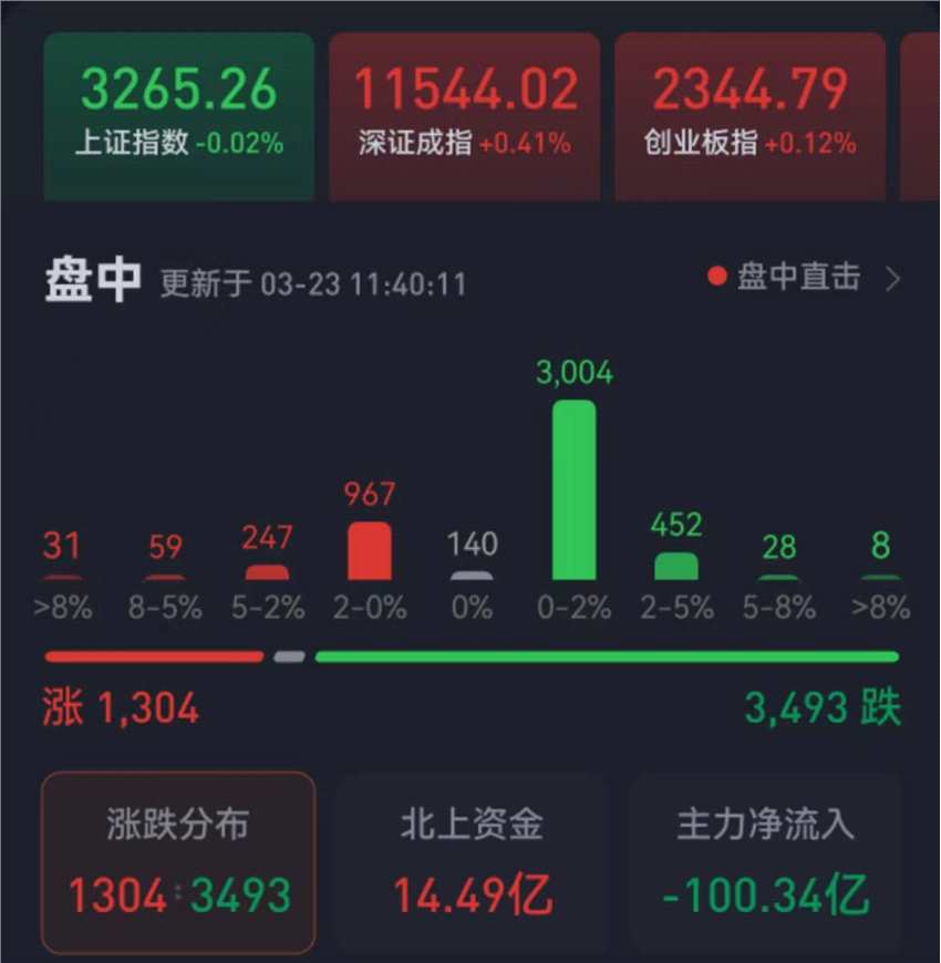 周四(3月23日),三大股指繼續(xù)震蕩分化,漲跌不一。截至上午收盤,上證指數(shù)跌幅0.02%,報3265.26點(diǎn);深證成指和創(chuàng)業(yè)板指漲幅分別為0.41%和0.12%;滬深兩市合計成交額6040.9億元,總體來看,兩市個股跌多漲少。