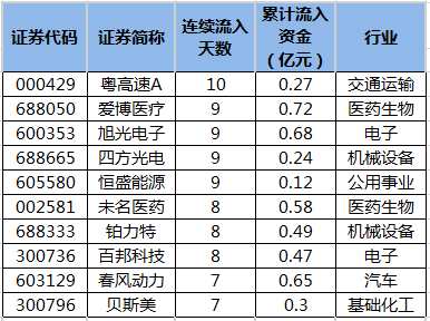 數據寶統(tǒng)計,截至3月31日收盤,滬深兩市共有63只個股連續(xù)5日或5日以上主力資金凈流入。連續(xù)流入天數最多的是粵高速A,已連續(xù)10個交易日凈流入。連續(xù)凈流入天數較多的還有愛博醫(yī)療、旭光電子(600353)、四方光電、恒盛能源(605580)、未名醫(yī)藥(002581),分別獲9個、9個、9個、9個、8個交易日凈流入。