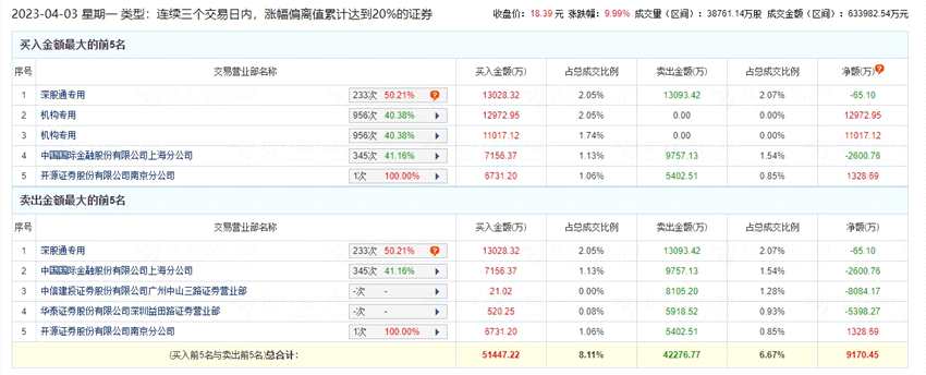 摘要: 北京4月3日訊深科技(000021)(000021.SZ)今日股價(jià)漲停,收報(bào)18.39元,漲幅9.99%。龍虎榜數(shù)據(jù)顯示,作為連續(xù)三個(gè)交易日內(nèi)漲幅偏離值累計(jì)達(dá)到20%的證券,
