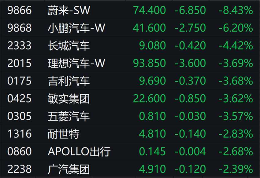截至發(fā)稿,蔚來跌超8%,小鵬汽車跌超6%,長城汽車(601633)跌4%,理想汽車、吉利汽車、五菱汽車跌超3%。