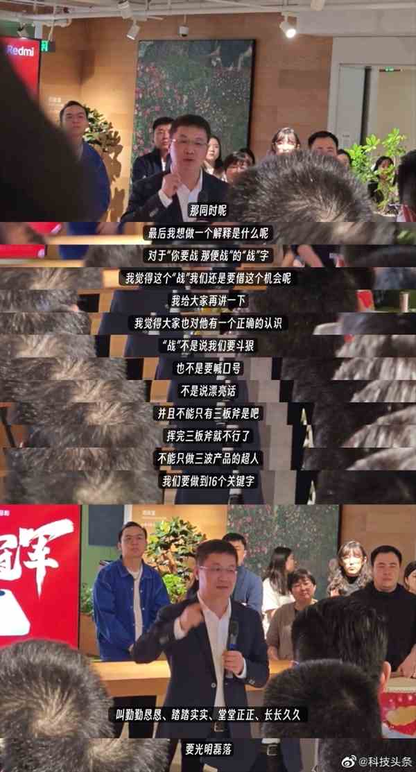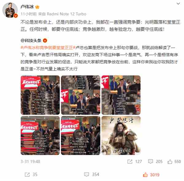 日前,盧偉冰轉(zhuǎn)發(fā)他在內(nèi)部慶功會的微博時表示,“不論是發(fā)布會上,還是內(nèi)部慶功會上,我都在一直強調(diào)競爭要:光明磊落和堂堂正正。任何時候,都要守住底線;競爭越激烈,越考驗定力,越要守住底線!”