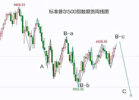 從美股來(lái)看,由于反彈結(jié)構(gòu)展開(kāi),因此要大的結(jié)構(gòu)要重新劃分。從標(biāo)普500指數(shù)期貨周線圖來(lái)看,可以看作是一個(gè)復(fù)雜的平臺(tái)型反彈,目前是B-c浪中的c5浪。周二股指沖高回落,這里可能是高點(diǎn),也可能是次高點(diǎn),目前尚不能確認(rèn),還需要繼續(xù)觀察??傊m然反彈超預(yù)期,但現(xiàn)在來(lái)看結(jié)構(gòu)倒是更加清晰了。短期的反彈不會(huì)改變什么,主跌浪只是被推后了,最快下周就會(huì)再度啟動(dòng)。