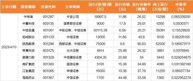 這10只股票分別為:中信金屬(601061)、中重科技(603135)、常青科技(603125)、江鹽集團(tuán)(601065)、柏誠股份(601133)、中電港(001287)、海森藥業(yè)(001367)、陜西能源(001286)、登康口腔(001328)、南礦集團(tuán)(001360),基本發(fā)行信息如下表: