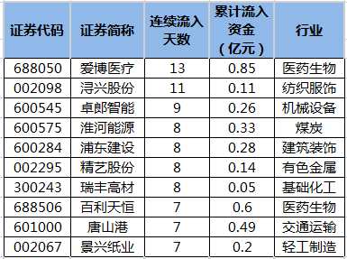 數(shù)據(jù)寶統(tǒng)計(jì),截至4月7日收盤,滬深兩市共有72只個(gè)股連續(xù)5日或5日以上主力資金凈流入。連續(xù)流入天數(shù)最多的是愛博醫(yī)療,已連續(xù)13個(gè)交易日凈流入。連續(xù)凈流入天數(shù)較多的還有潯興股份(002098)、卓郎智能(600545)、淮河能源(600575)、浦東建設(shè)(600284)、精藝股份(002295),分別獲11個(gè)、9個(gè)、8個(gè)、8個(gè)、8個(gè)交易日凈流入。