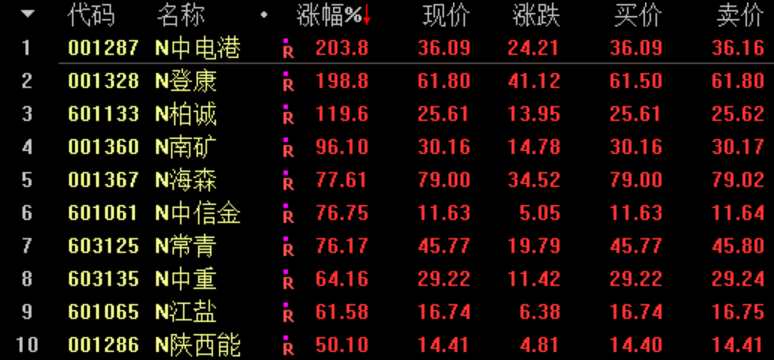 主板注冊(cè)制首批10只新股上市首日集體高開(kāi),多數(shù)已觸發(fā)臨停。截至發(fā)稿時(shí),N中電港(001287)漲幅203.8%,N登康(001328)漲幅198.8%,N柏誠(chéng)(601133)、N南礦(001360)觸發(fā)臨停,N中信金(601061)、N常青(603125)、N海森(001367)、N江鹽(601065)、N中重(603135)、N陜西能(001286)保持強(qiáng)勢(shì)上漲。