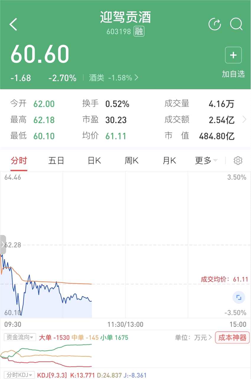截至揚(yáng)子晚報(bào)/紫牛新聞?dòng)浾甙l(fā)稿,中證白酒指數(shù)跌幅1.14%,其中迎駕貢酒跌幅1.93%。