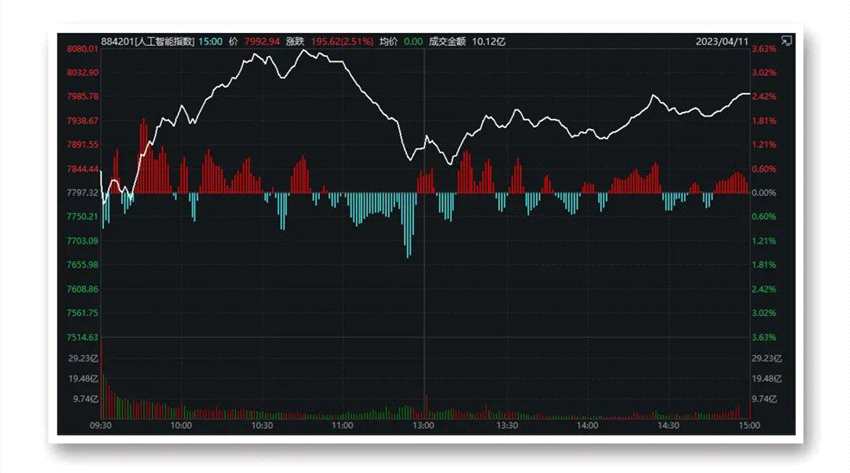 4月11日,上一個(gè)交易日大跌的AI主線,今日早盤開盤暴漲,但臨近午盤大幅跳水,午后短暫下探后企穩(wěn)回升。截至收盤,人工智能指數(shù)上漲2.51%。