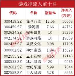 游戲板塊今日領漲A股,32只成分股平均漲幅高達6.31%。機構流入額超過億元的有7只個股,其中昆侖萬維(300418)流入5億元,漲幅12.06%,湯姆貓(300459)流入4.27億元,漲幅7.66%,完美世界(002624)漲停,流入3.93億元,游族網(wǎng)絡(002174)漲停,流入1.9億元,凱撒文化(002425)漲停,流入1.77億元,神州泰岳(300002)流入1.53億元,漲幅1.94%,三七互娛(002555)流入1.21億元,漲幅4.65%。另外冰川網(wǎng)絡(300533)20CM漲停,流入9985萬元。