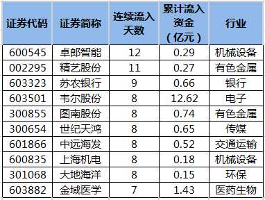數(shù)據(jù)寶統(tǒng)計(jì),截至4月12日收盤,滬深兩市共有71只個(gè)股連續(xù)5日或5日以上主力資金凈流入。連續(xù)流入天數(shù)最多的是卓郎智能(600545),已連續(xù)12個(gè)交易日凈流入。連續(xù)凈流入天數(shù)較多的還有精藝股份(002295)、蘇農(nóng)銀行(603323)、韋爾股份(603501)、圖南股份(300855)、世紀(jì)天鴻(300654),分別獲11個(gè)、9個(gè)、8個(gè)、8個(gè)、8個(gè)交易日凈流入。