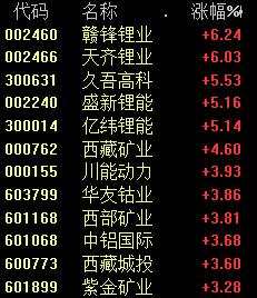 鹽湖提鋰板塊也上漲,贛鋒鋰業(yè)(002460)、天齊鋰業(yè)(002466)、華友鈷業(yè)(603799)等龍頭股都大漲。