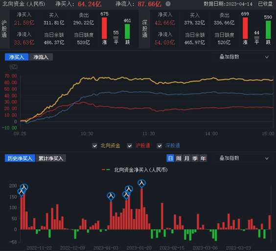 4月14日,A股三大指數(shù)震蕩上揚(yáng),集體收漲,滬指創(chuàng)年內(nèi)收盤新高,均線系統(tǒng)呈多頭排列,深證成指和創(chuàng)業(yè)板指在形態(tài)和均線排列上弱于滬指。截至收盤,上證指數(shù)漲0.60%報(bào)3338.15點(diǎn);深證成指漲0.51%報(bào)11800.09點(diǎn),創(chuàng)業(yè)板指漲0.93%報(bào)2428.09點(diǎn),A股合計(jì)成交額11154.32億元,較前一交易日縮減1.93%;北向資金全天凈買入64.24億元;其中滬股通凈買入21.58億元,深股通凈買入42.66億元。今日A股漲多跌少,有2736只上漲,2183只下跌。